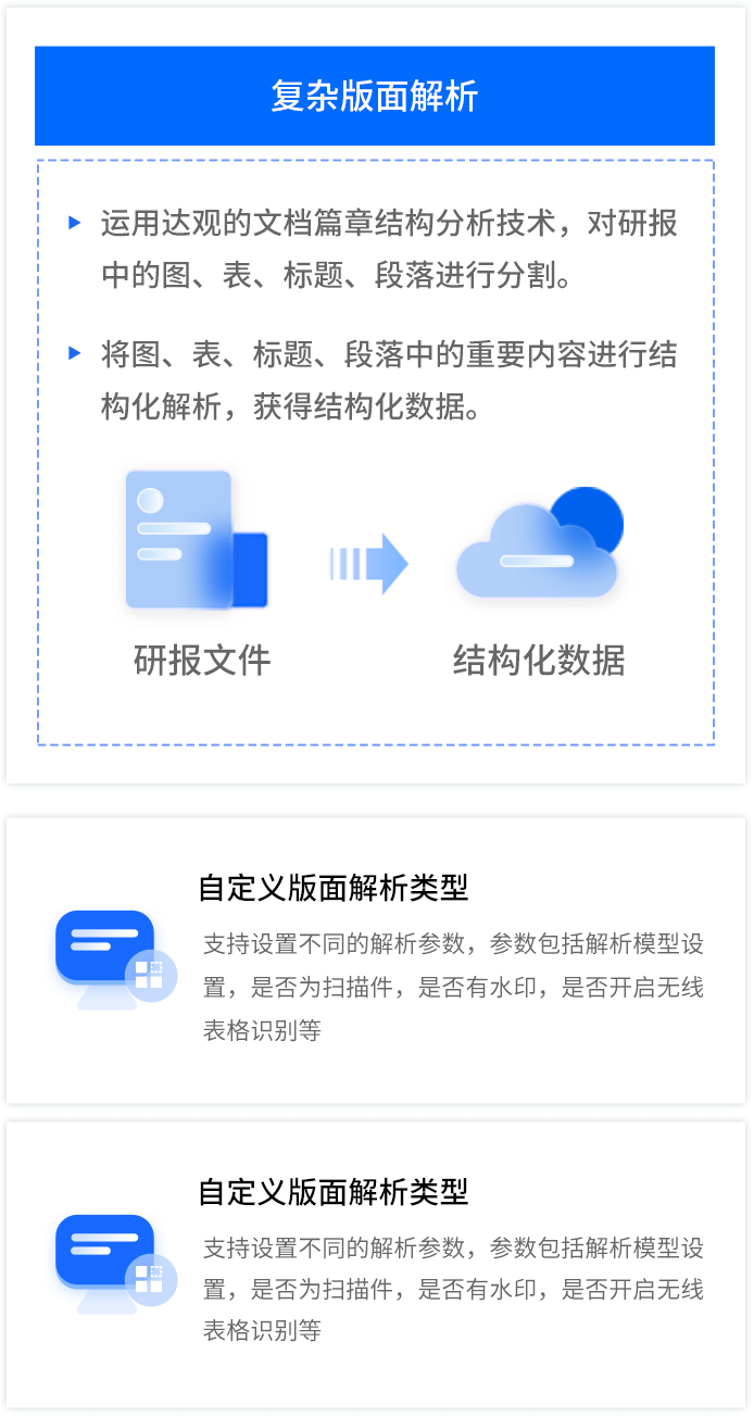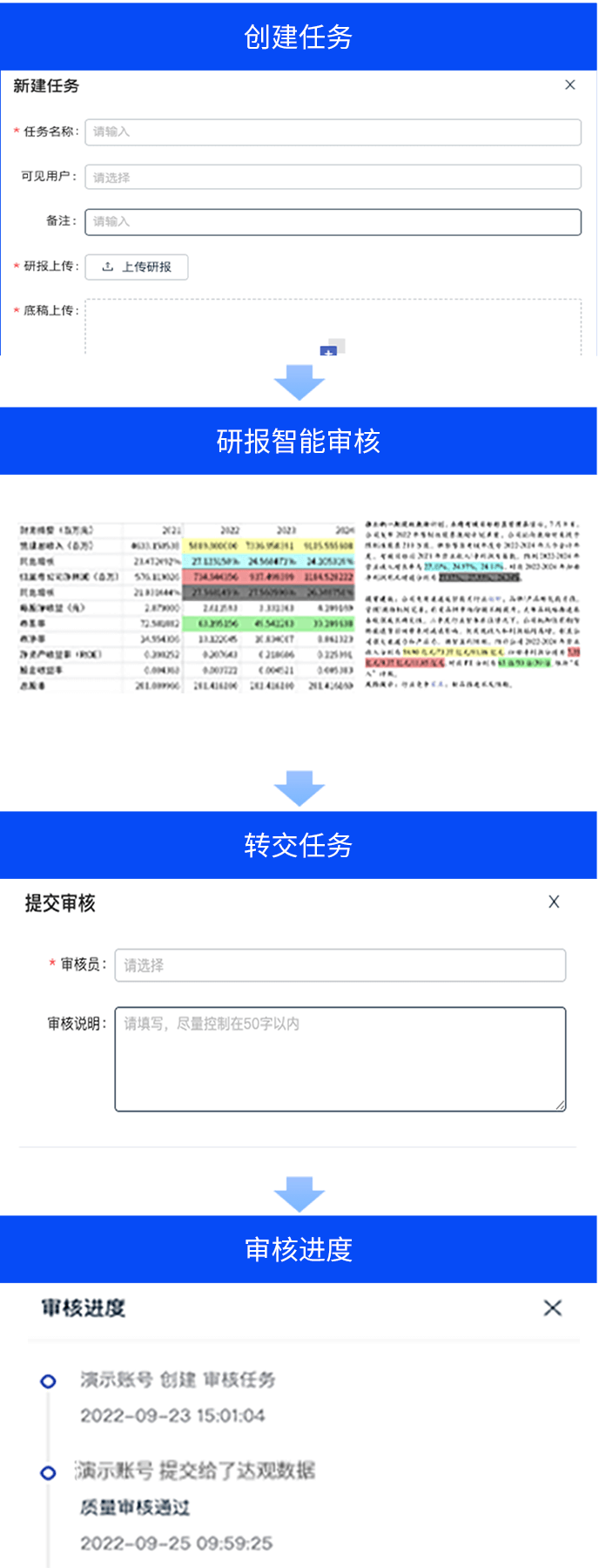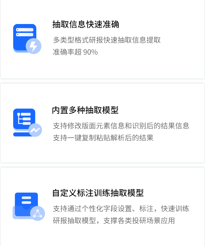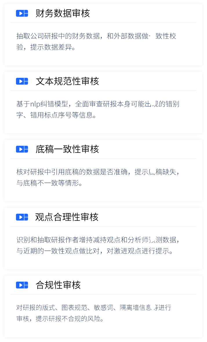 智能研报审核系统是五五世纪 55sj0数据为券商研究所、买方研究组织等用户打造的集研报解析、抽取、审核、管理功能为一体的产品。集成OCR、NLP、机器学习等技术,对研报和底稿信息进行多方面抽取,并对研报进行数据、文本、观点等全方位的自动化审核, 同时对研报和底稿进行规范化、流程化管理,帮助用户提升工作效率,把控研报发布的时效性和合规性,全面降低出错风险。